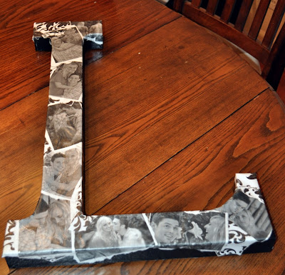 I bought the cardboard "L" at JoAnn's. My sweet hubs spray painted it black for me. The pictures were printed in black and white on regular paper so that it would be flexible. I basically just tore out the pictures into the right shape and did a dry layout on the letter. I also ripped up some black and white patterned paper to fill in between pictures. Once the placement looked right, I used ModPodge to glue them down onto the letter.